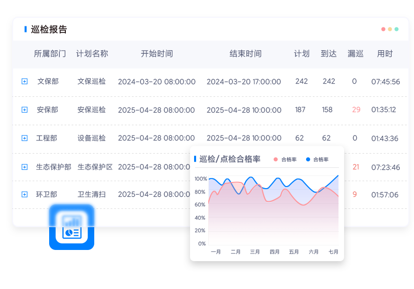 • 详细记录了迟到、早到、停留时间、巡检用时。