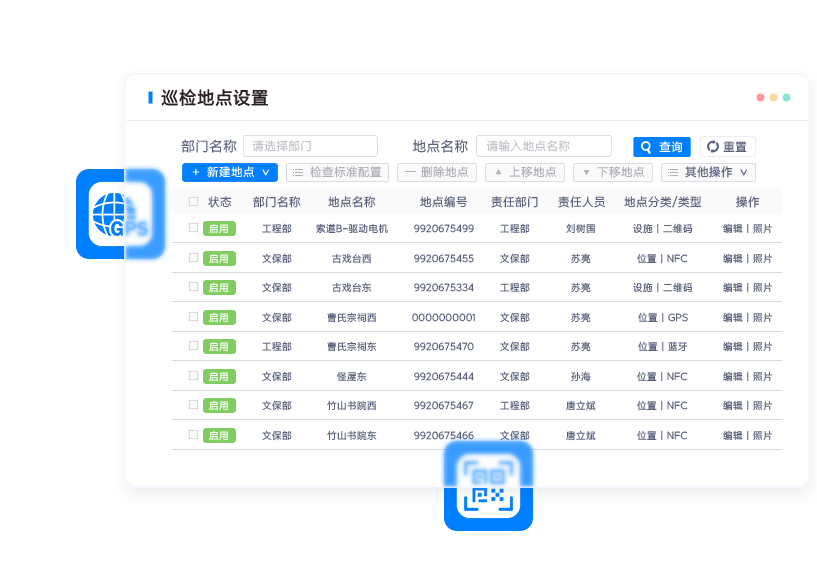 • 二维码、NFC、蓝牙巡检点,适用于车间内设备点检与日常巡检。