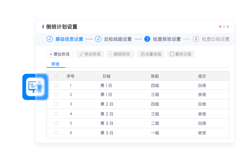 • 日常巡检、点检计划、保养计划、临时任务、按次巡检、按时巡检。