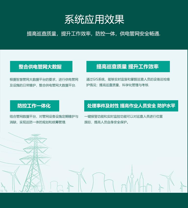 通过《智慧电网GPS巡检管理系统》,规范巡回检查行为,强化巡查质量,实现供电管网防控工作科学化、规范化、智慧化和大数据平台化的推进和实施,确保供电官网安全畅通。