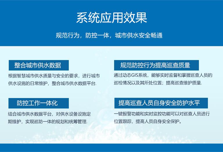 通过《城市水务GPS巡检管理系统》,规范巡检行为,强化巡查质量,实现城市供水防控工作科学化、规范化、智慧化和平台化的推进和实施,确保城市供水安全畅通。