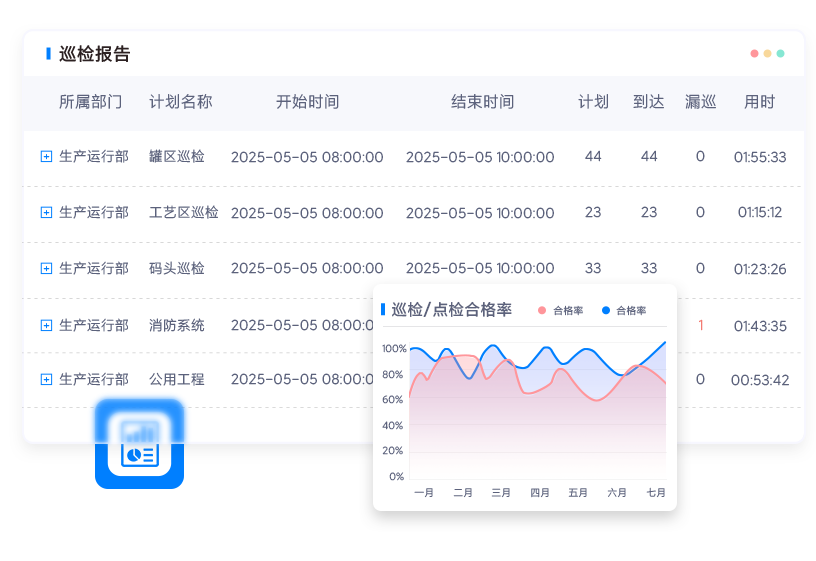 • 实时数据显示计划名称、巡检地点、巡检人员、巡检时间。