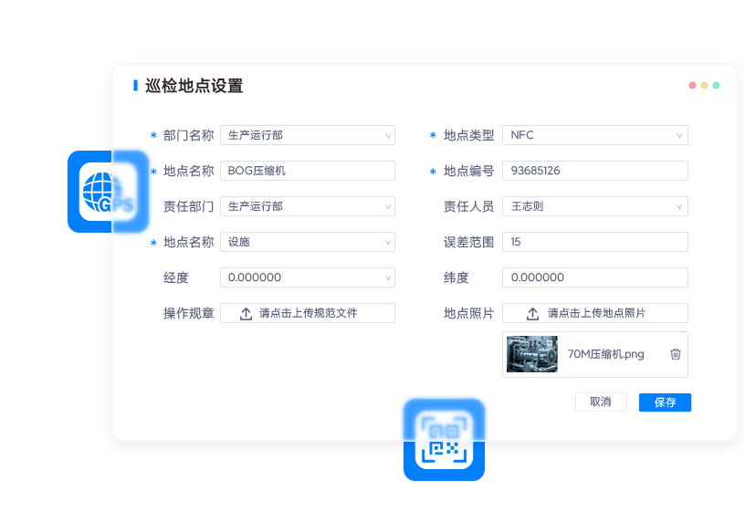 • 二维码、NFC、蓝牙巡检点,适用于车间内设备点检与日常巡检。